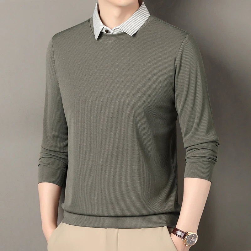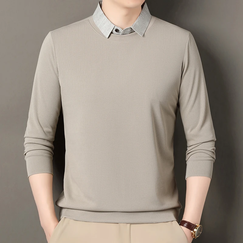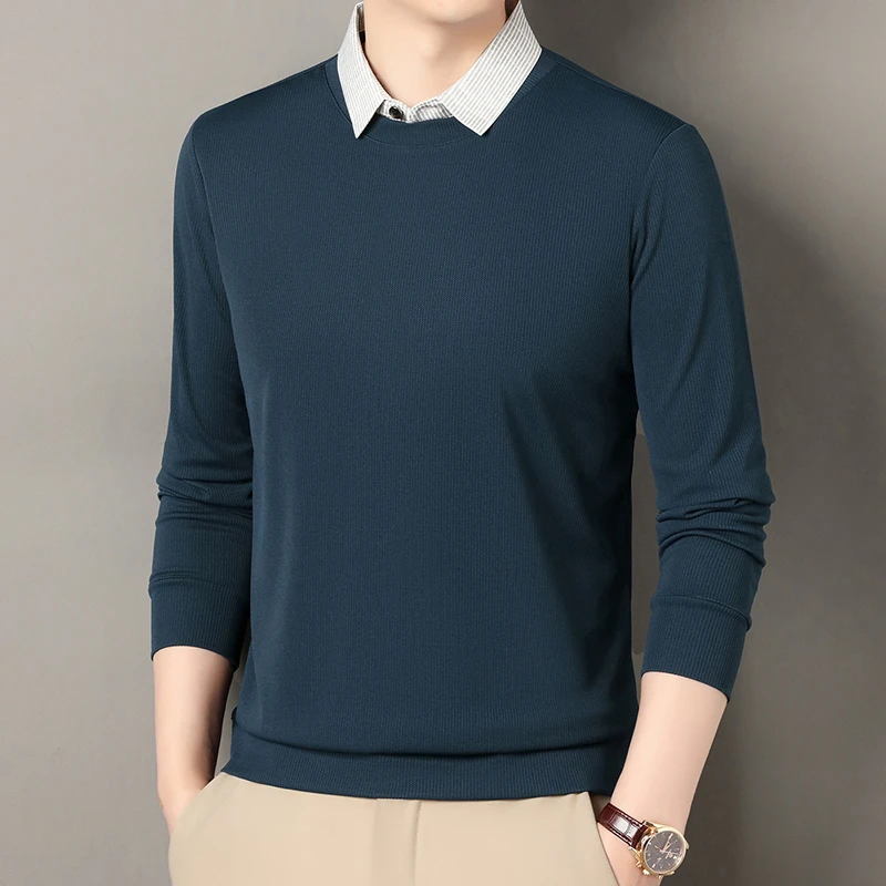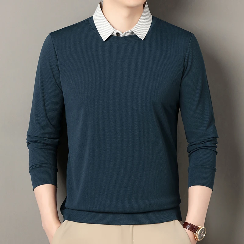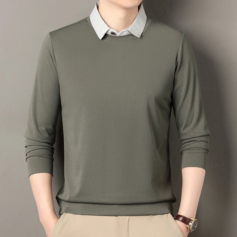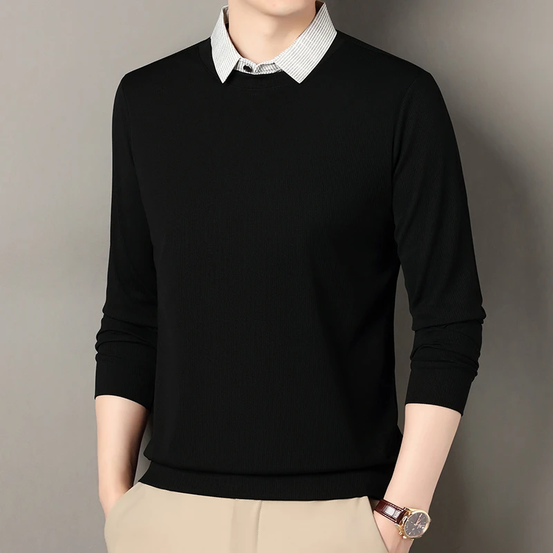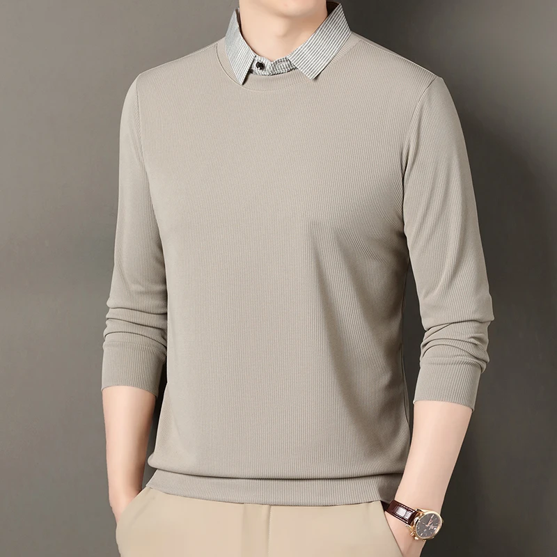 2025 New Men’s Fake Two Piece Polo Shirt Casual Fashion Long Sleeve Collar T-shirt Versatile Top