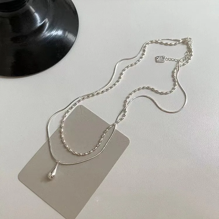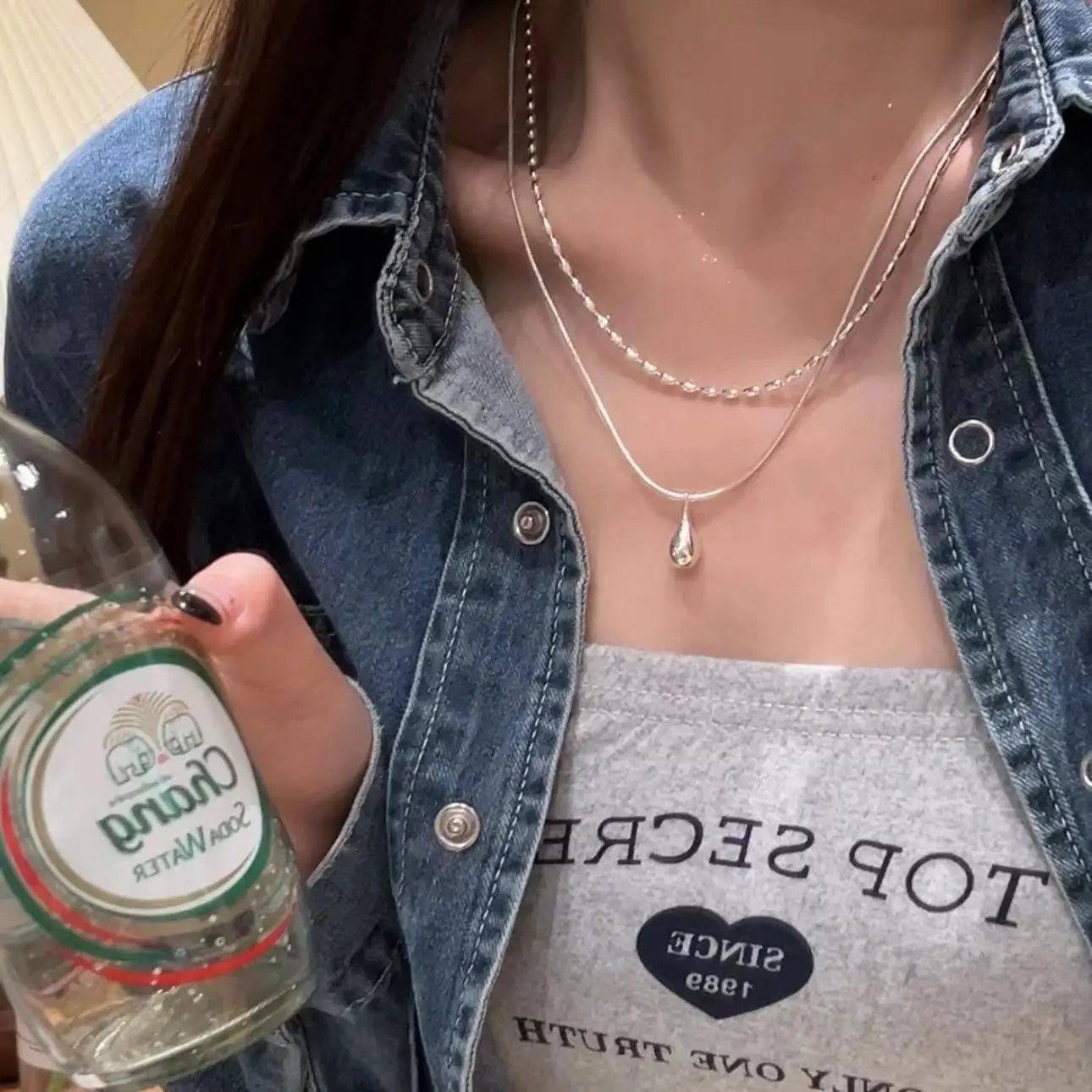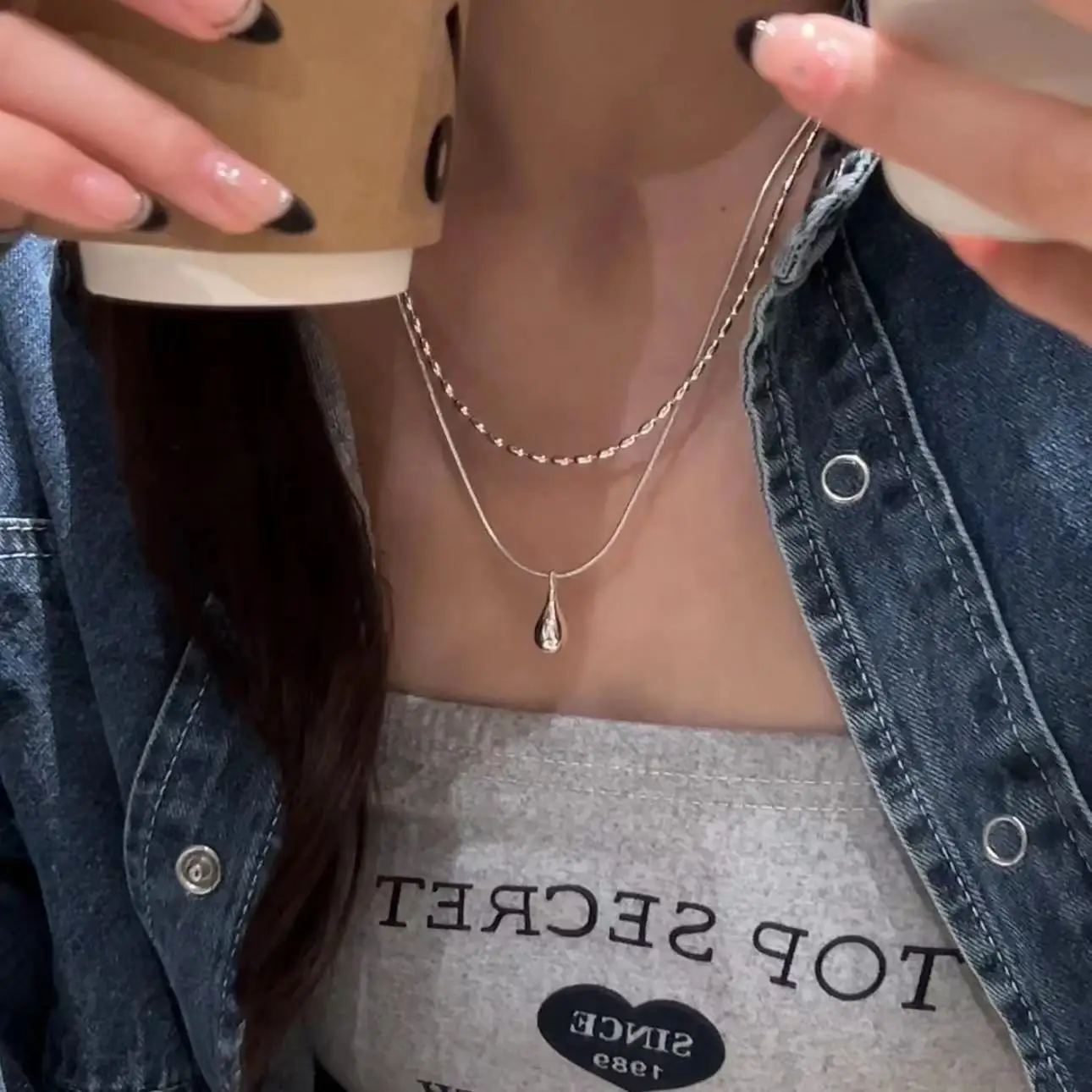 Fashion Silver Color Double Layer Waterdrop Pendant Necklace for Women Minimalist Metal Bead Clavicle Chain Necklace Jewelry