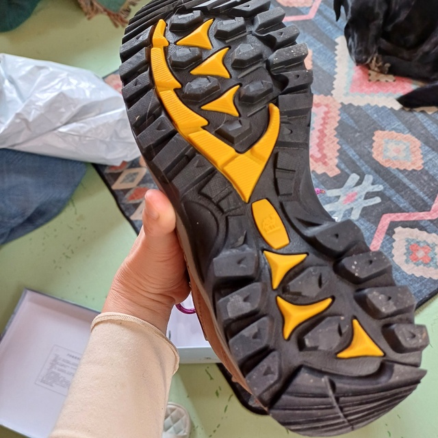 • The outsole features 0.5cm deep treads, providing strong anti-slip grip on rugged terrain. The herringbone pattern throughout the sole enhances wear resistance and extends the lifespan of the sole.