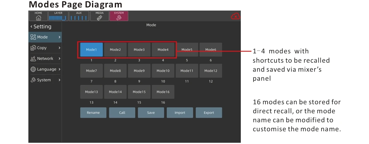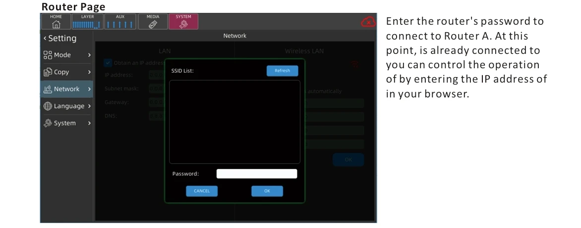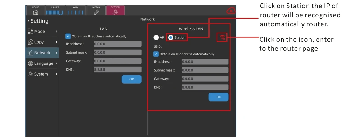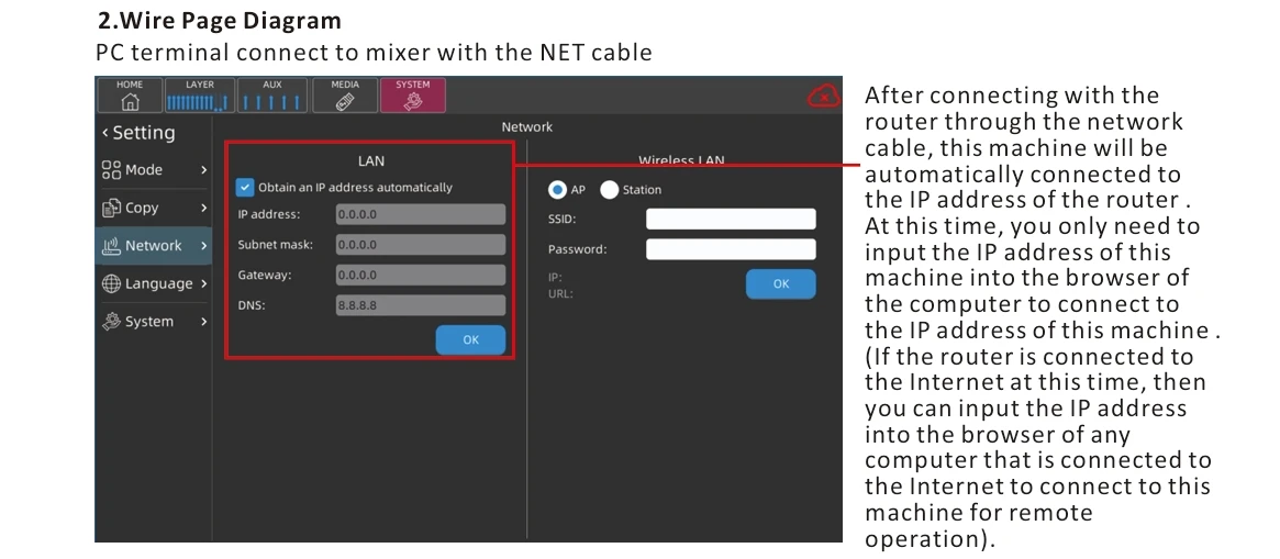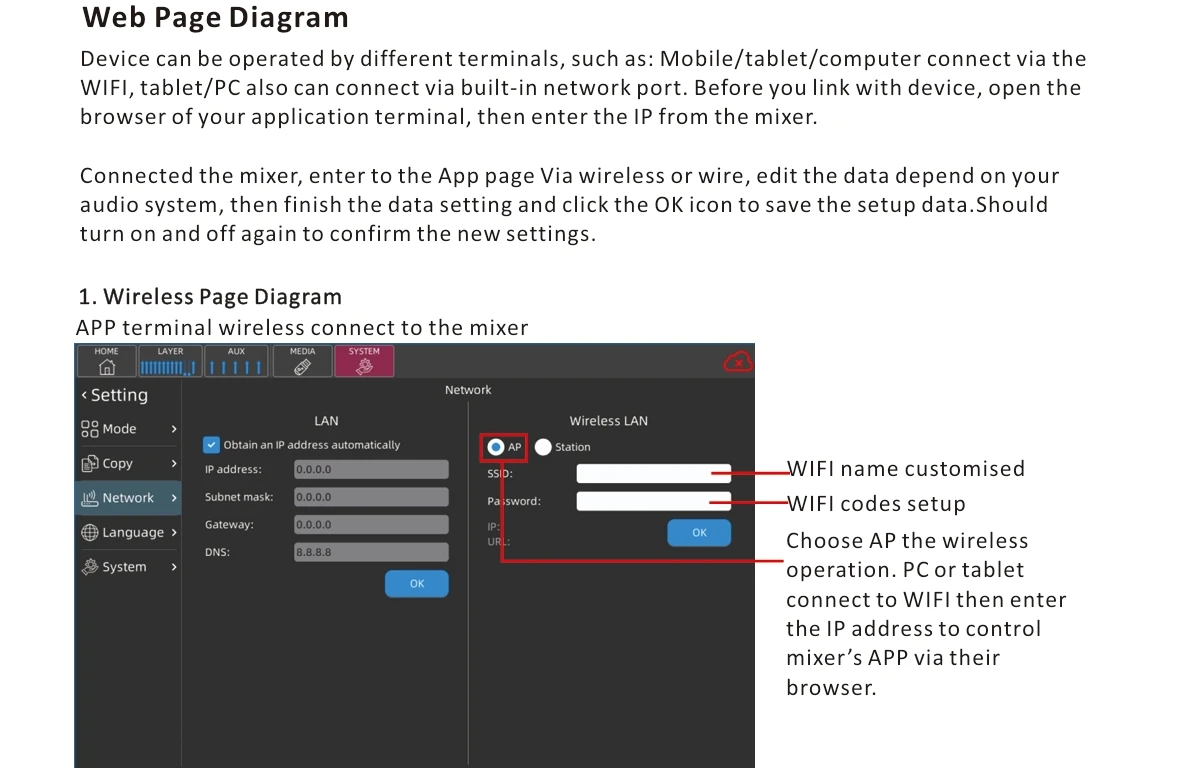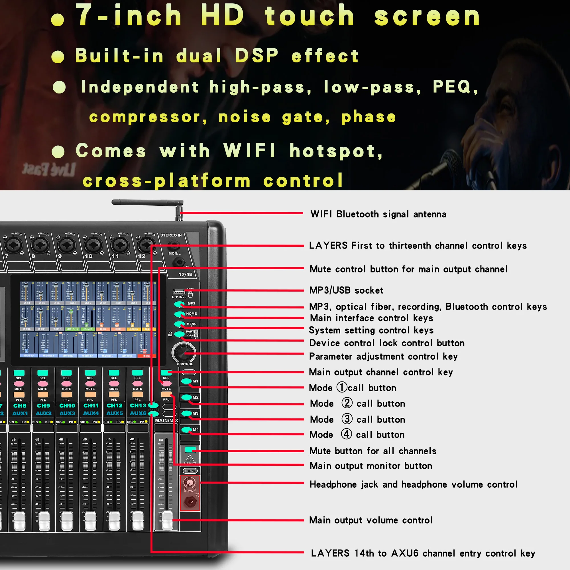 قاعدة تصميم نموذج الخلاط الرقمي على معايير الأداء الاحترافي، يتم تطبيقه على الأداء والموسيقى والمسرح والاستوديو وغرفة الاجتماعات وما إلى ذلك. تعزيز الصوت ونظام العناوين العامة.وظائف تنافسية تلبي مع المهنيين.إنه تصميم محمول وسهل التشغيل، مع أجهزة FX عالية الجودة، حتى المستخدم الجديد يمكنه الإمساك بسرعة بتشغيل الجهاز.يمكن عمل تطبيق الخلاط هذا في أنظمة تشغيل مختلفة، مثل: iOS، Android، Windows، Mac OS وLinux وما إلى ذلك..والتي يتم التحكم فيها عن بعد عبر الهاتف المحمول والأجهزة اللوحية والكمبيوتر عن طريق الاتصال بإشارة WIFI / نقطة الاتصال الخاصة بالخلاط، أو عن بعد عن طريق توصيل الخلاط بجهاز كمبيوتر عبر كابل الشبكة.