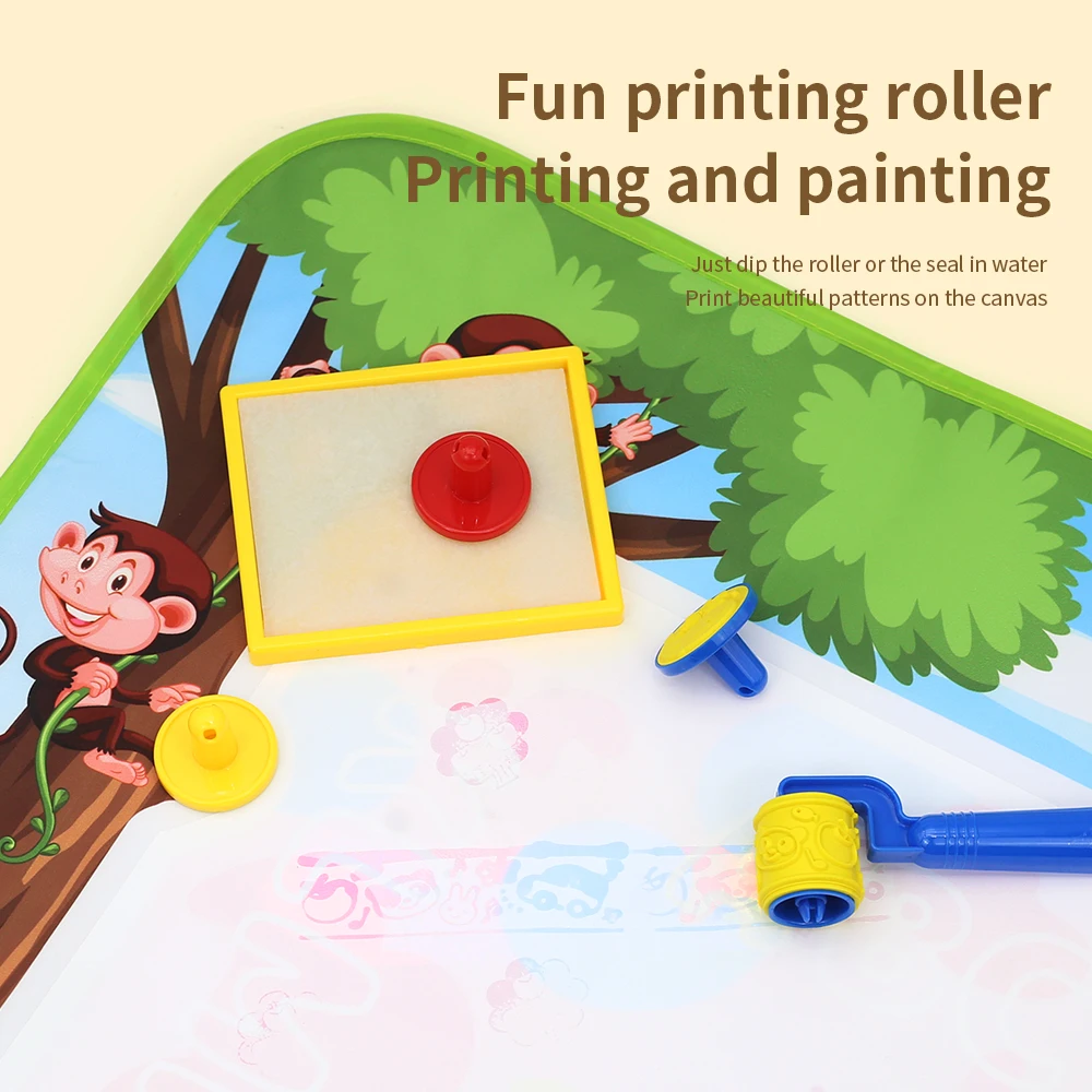 - 【Water Drawing Mat with variety of accessories】Package contains: doodle mat, water paintbrush, picture album,roller seal,large and small eva. This mess free coloring mat is light and foldable, easy to store.