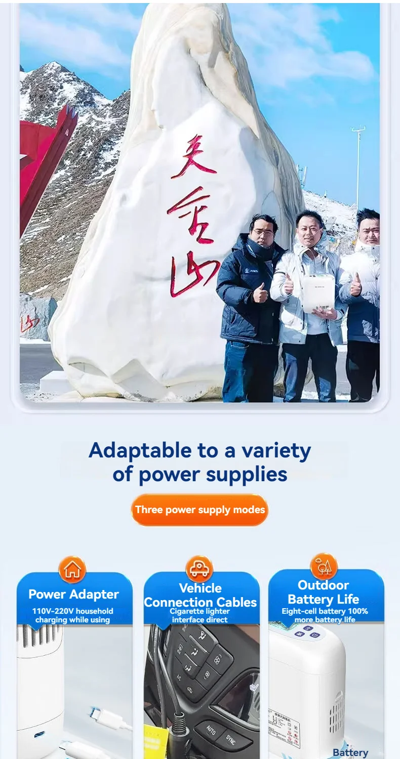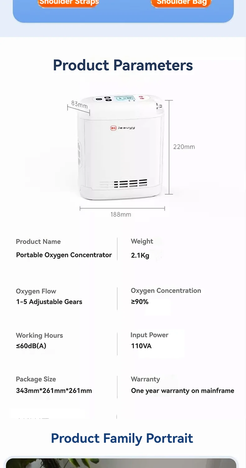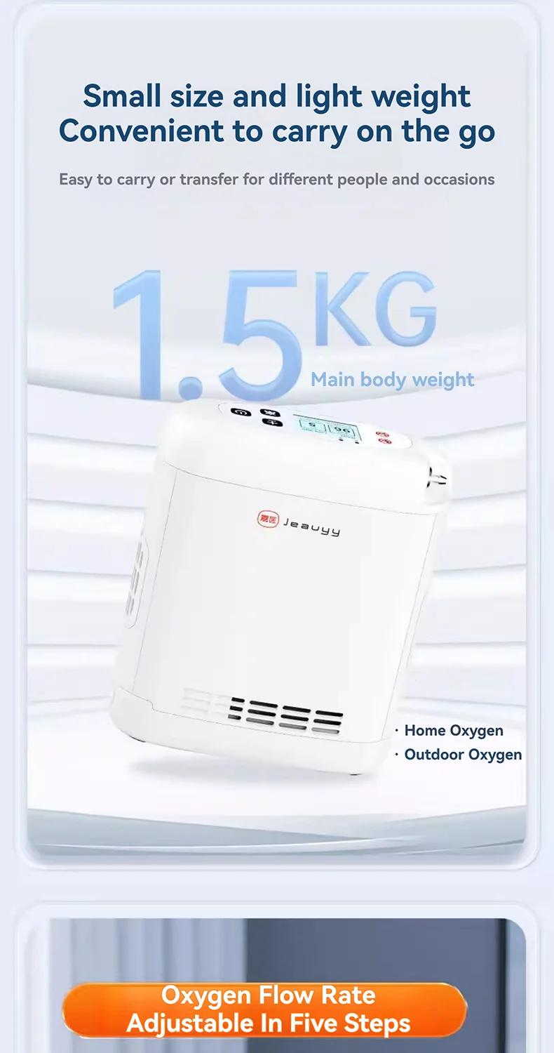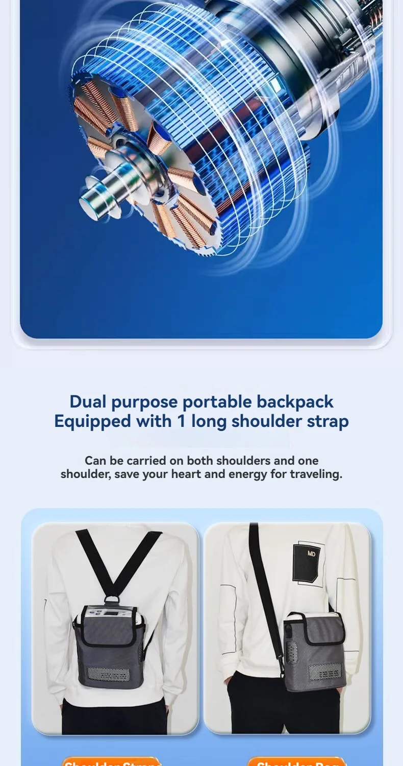 This oxygen concentrator is lightweight, only 2.1 kg, and comes with a multifunctional bag that can be held, slung across one shoulder or both shoulders, making it more convenient to provide a reliable source of oxygen on the go. Very suitable for outdoor, plateau use, car use, etc.