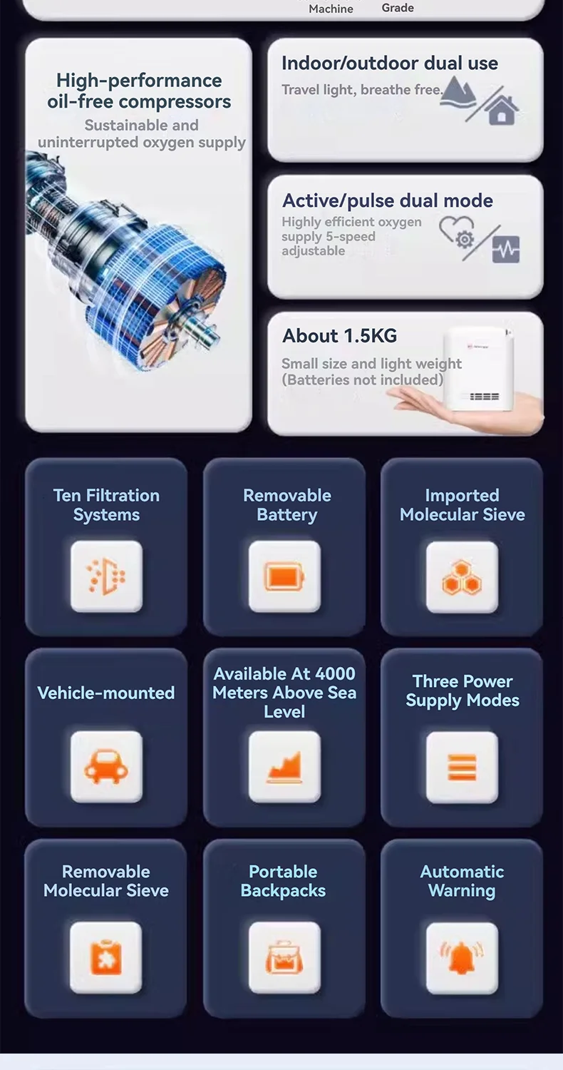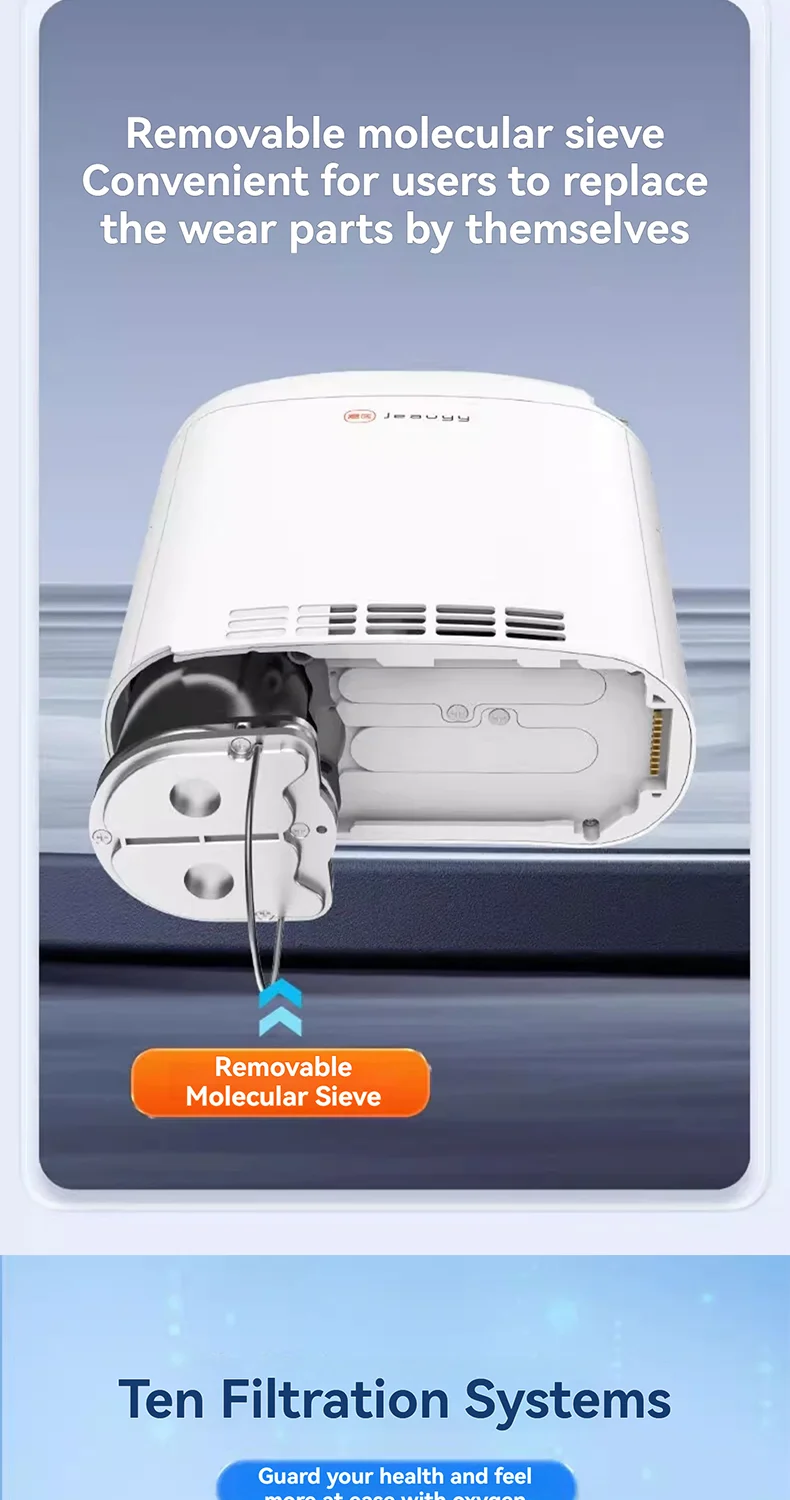 Our oxygen generator features an advanced built-in alarm system that provides real-time alerts when the battery is low, no breathing is detected, oxygen concentration is low, or temperature is too high. This allows you to control your oxygen therapy process with peace of mind