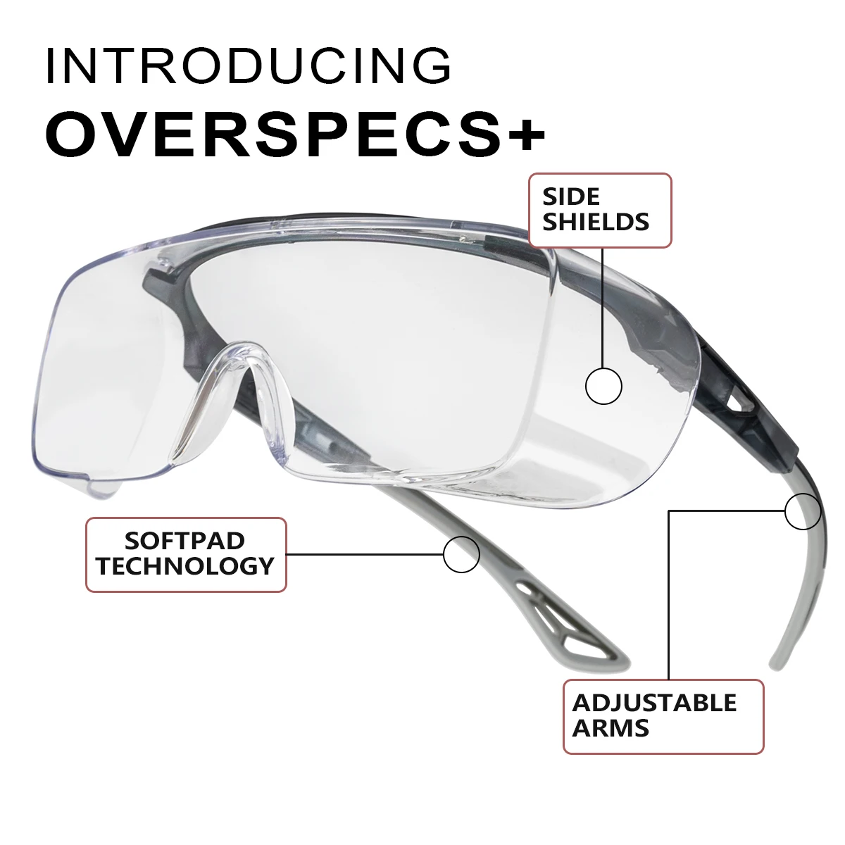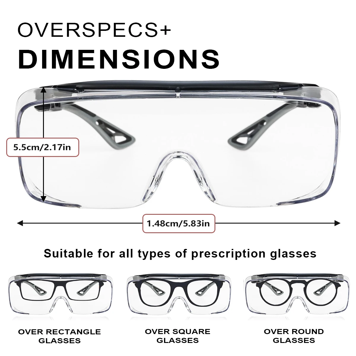 2.These goggles that fit over glasses can be comfortably worn over standard frames up to 5.7in wide, 1.37in high on the sides & 1.77in high at the center. Ideal as shooting glasses over eyeglasses, for woodworking, construction, or as medical safety glasses for lab work.