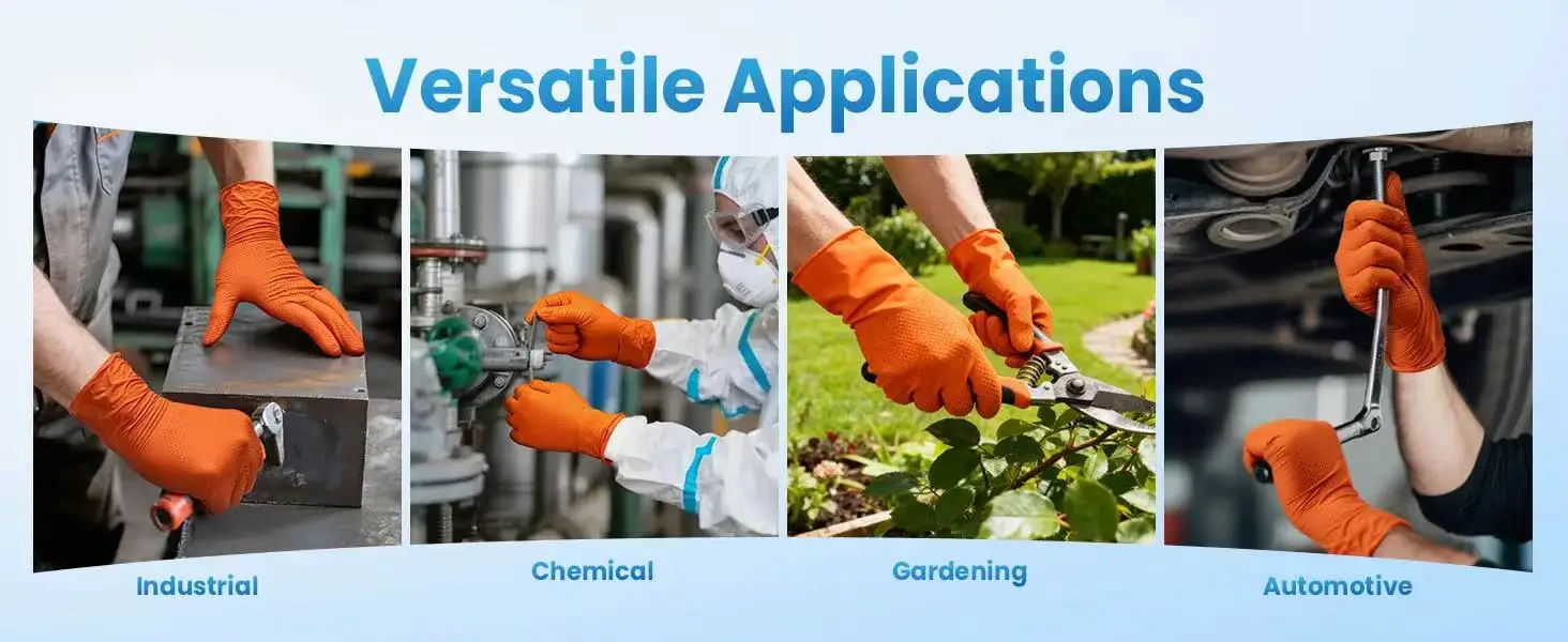 4. Versatile: Our durable safety protection gloves are worn worldwide in the most common home or workplace environments. The gloves are safe for household cleaning, sanitation, gardening, home, automotive, mechanical, industrial, manufacturing, workshop, painting, chemicals, tattoo artists, salon professionals, and schools, indoors and outdoors.