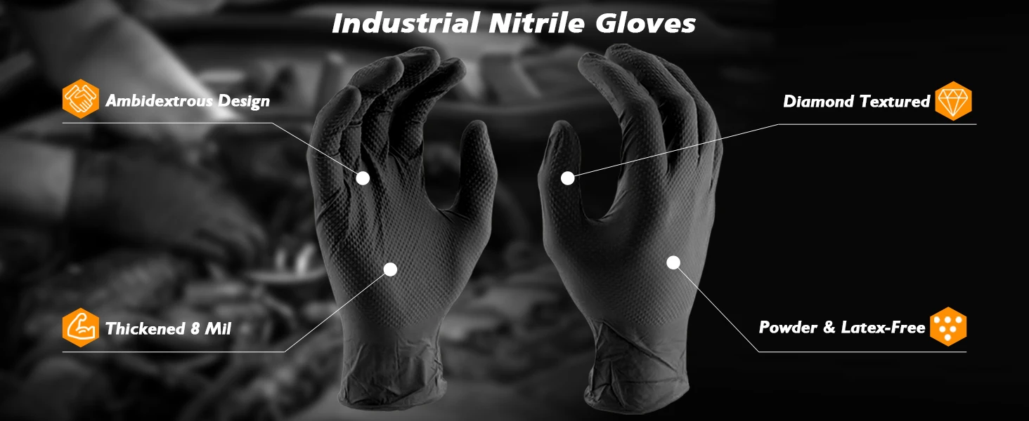 8Mil Heavy Duty Black Nitrile Gloves Diamond Textured Safety Work Gloves for Household Gardening Industrial Mechanic Auto Gloves