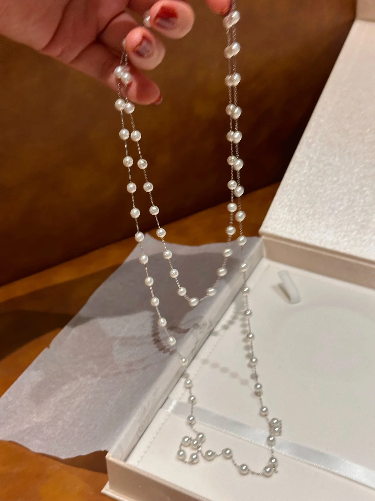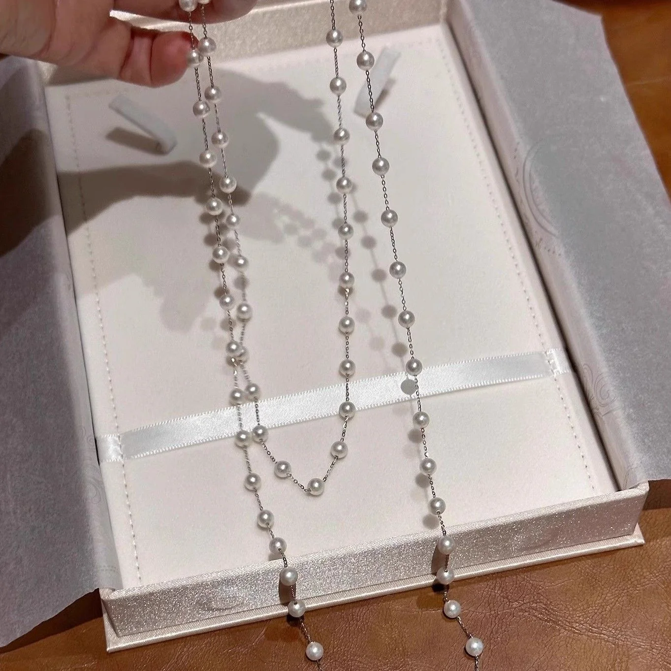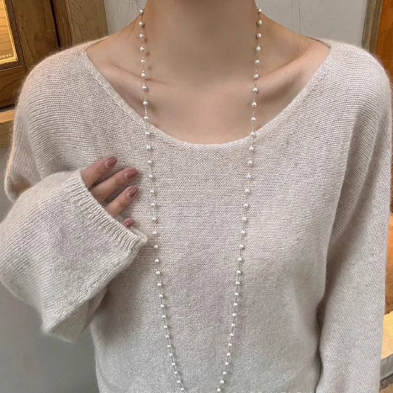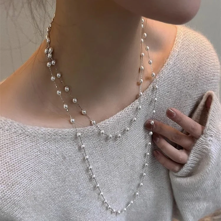 Vintage Handmade Double Layer White Imitation Pearl Necklace For Women Bead Long Sweater Chain Necklace Wedding Jewelry Gift