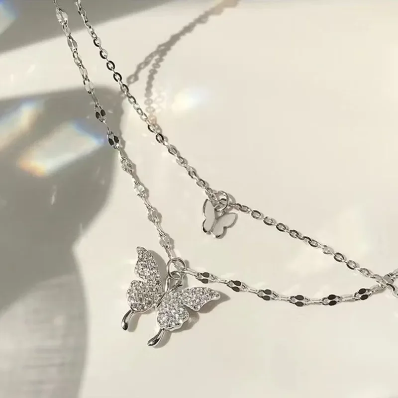 Women Shiny Butterfly Necklace Fashion Double Layer Pendant Cross Choker Neck Chain Light Luxury Clavicle Chain Party Jewelry