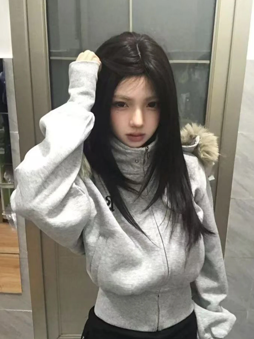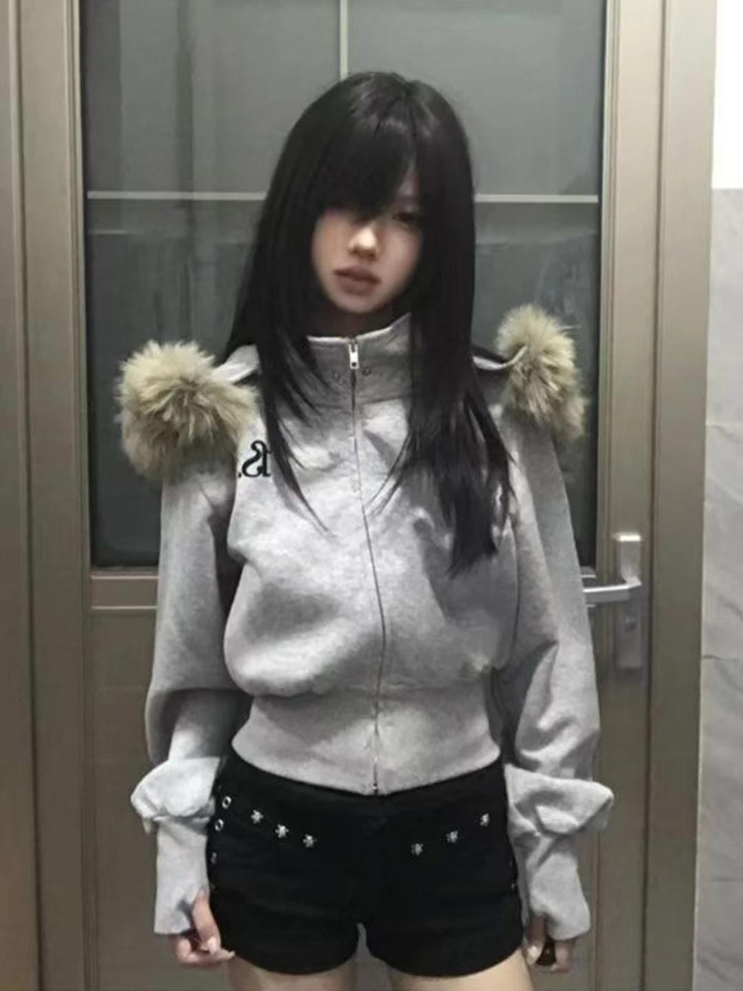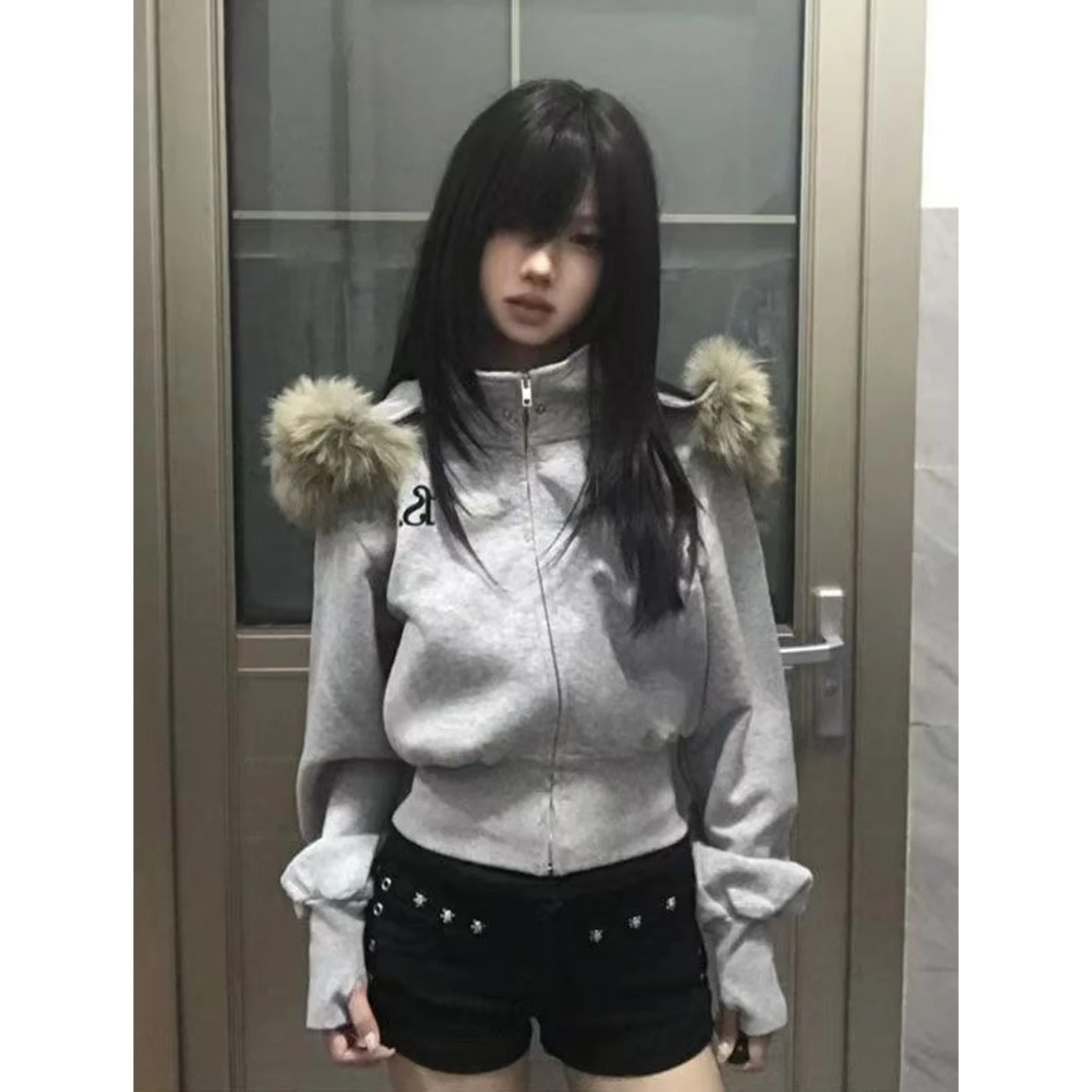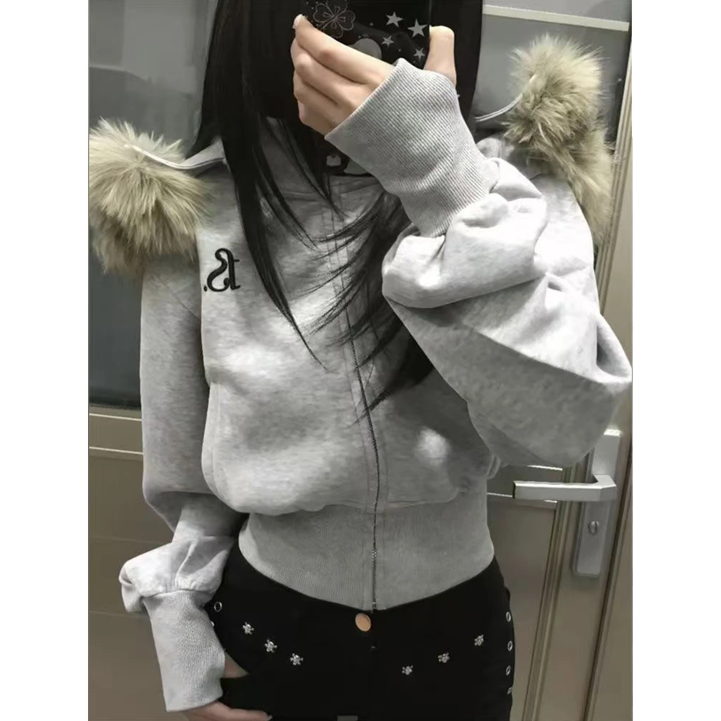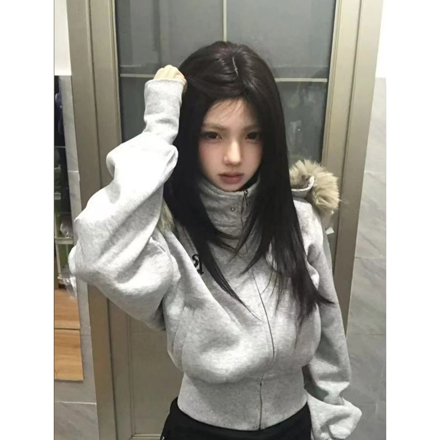 Women’s Fleece Lined Hooded Jacket American Style Short Sweatshirt Coat High Waist Slimming Autumn Winter Outerwear
