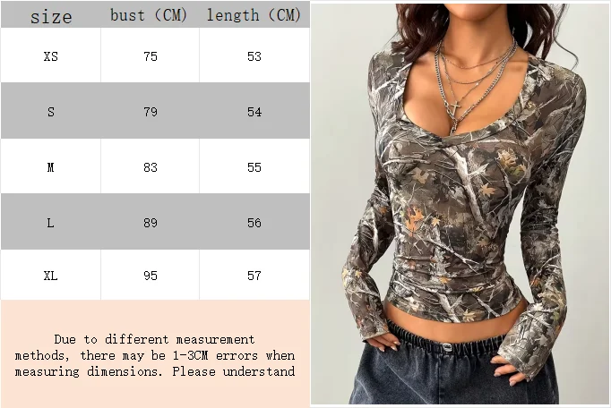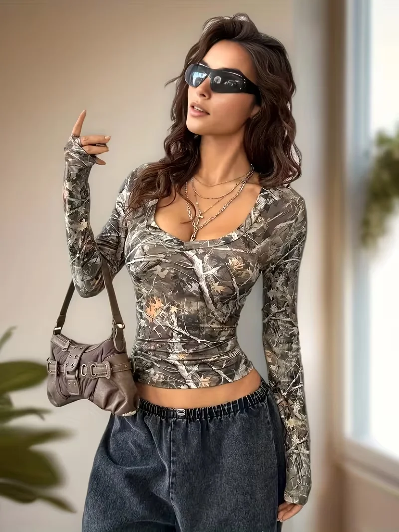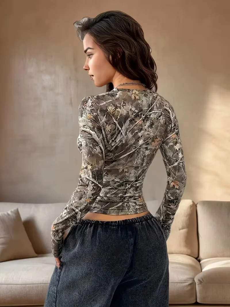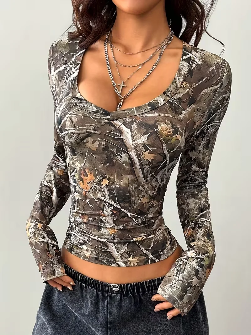 Women’s Y2K Street Top Tree Branch Pattern Full V-neck T-shirt